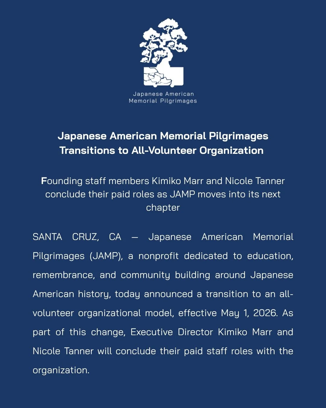 SANTA CRUZ, CA — Japanese American Memorial Pilgrimages (JAMP), a nonprofit dedicated to education, remembrance, and community building around Japanese American history, today announced a transition to an all-volunteer organizational model, effective May 1, 2026. As part of this change, Executive Director Kimiko Marr and Nicole Tanner will conclude their paid staff roles with the organization.